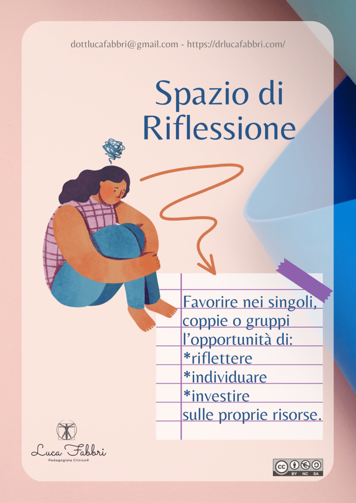 Lo Spazio di riflessione è un servizio rivolto alla persona in diversi ambiti: Scuola, Quartieri, Comuni, Province, istituzioni pubbliche e private, teso a rispondere ai bisogni educativi e sociali degli allievi, a sostenere gli insegnanti nella gestione della classe, a promuovere una efficacia educativa nelle componenti genitoriali, e a favorire singoli, coppie o gruppi offrendo loro l’opportunità di riflettere, individuare e investire sulle proprie risorse.